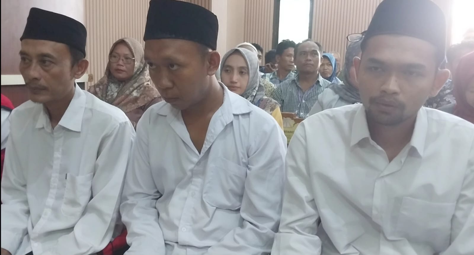 Romiati, istri dari terdakwa Gito Zaenal, langsung bersujud di depan pintu ruang sidang.